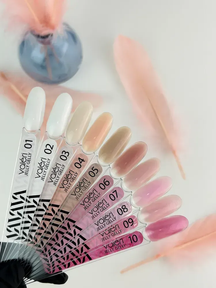 Valeri Jelly Gelly Collection je tixotropní gel na modeláž a opravy nehtů s konzistencí podobnou želé, který vyniká skvělou přilnavostí a neuvěřitelným leskem. Ideální pro prodlužování na dolní i horní formy, vhodný pro vymodelovanou francii (babyboomer) a pro tvorbu 3D designů. Gel-želé má hustou konzistenci, která nestéká, ale přitom se snadno vyrovnává štětcem.