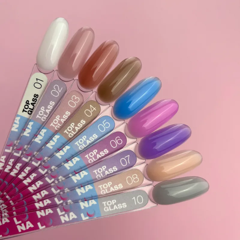 TOP GLASS — barevné top coaty bez lepivé vrstvy, které si zachovávají lesk až 4 týdny. Lze je používat v kombinaci s jinými povlaky pro vytvoření zajímavých designů a díky barevnému odstínu také samostatně pro trendy manikúru.
